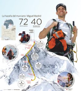 El pasado 21 de mayo, el alpinista de Pozo Aledo (San Javier), Miguel Madrid, vivió una experiencia similar. Ese día, a las 7.30 horas, puso un pie en China y Otro en Nepal, a 8.848 metros de altura. Se convirtió en el primer montañero nacido de la Región de Murcia en subir la montaña más alta y más famosa del mundo. También en el primer montañero español que lo ha conseguido en 2016. «Estuve diez minutos en la cima, muy puntiaguda este año, y comprobé que estar allí es un acto de supervivencia pura y dura».